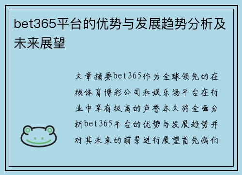 bet365作为全球领先的在线体育博彩公司和娱乐场平台,在行业中享有极高的声誉。本文将全面分析bet365平台的优势与发展趋势,并对其未来的前景进行展望。首先,我们将从四个核心方面探讨bet365的优势:强大的品牌影响力、创新的技术支持、全面的用户体验和多元化的产品服务。在每个方面,本文将详细讨论bet365如何通过这些优势不断巩固其市场地位。同时,文章还将分析bet365如何利用技术创新应对行业变化和挑战,探索其未来在全球市场中的发展潜力。最后,通过对这些因素的整合分析,本文将对bet365平台的未来发展进行总结和展望,进一步了解这一行业巨头如何继续在竞争激烈的市场中维持优势,并朝着更广阔的市场扩展。